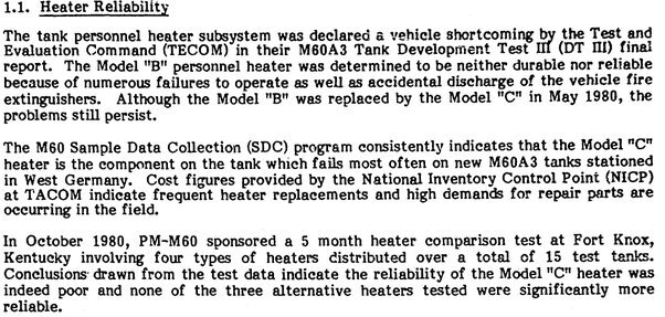 Т-72 также обладал отличной теплоизоляцией благодаря тяжёлой противорадиационной облицовке (которая заодно защищала и от радиации — чего не было у M60 и Leopard 1). Кроме того, у него был надёжный отопитель. Это означало, что внутри Т-72 зимой могло быть довольно комфортно. Представление о том, что все танки имели хорошую изоляцию и отопление, неверно, однако советские танки, предназначенные для эксплуатации в условиях до −40 °C, имели это в качестве обязательного требования ещё с 1950-х годов. M60A3 Patton образца 1980 года — не совсем: даже в мягких условиях Западной Германии американские системы отопления очень часто выходили из строя.