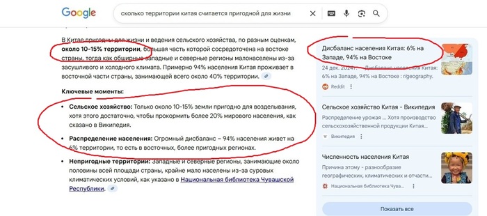 Или Китай. Вы пишете, что 50–60% территории Китая считается пригодной для жизни.