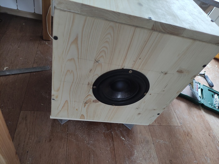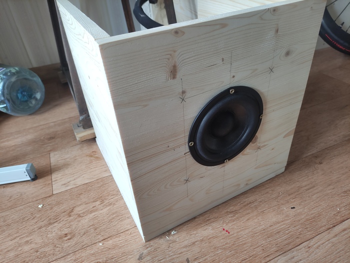 Мой динамик 5 дюймов. Это меньше оригинального проекта, но для первого раза будет норм + есть место "навырост". Объём куба я уменьшил искусственно ветошью. Что б было чуть ближе к правильному.