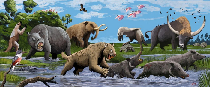 Справа — смилодон популятор. Посередине — ксеносмил. А слева человек, очень спокойный для той ситуации, в которой он оказался.