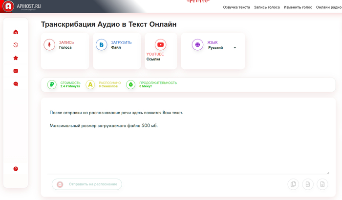 Apihost.ru — сервис транскрибации в онлайне: принимает файлы, микрофон или ссылку и может разобрать час записи за 6–10 минут.
