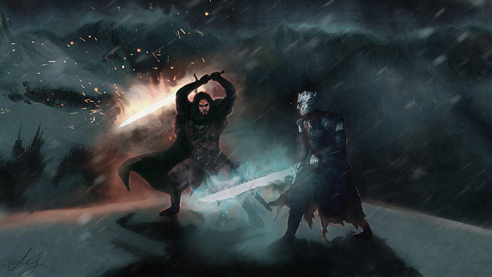 Кстати, заметьте-ка таки интересную тенденцию) Ходоки дрались с людьми самолично в первых сезонах, пока были неуязвимы для них, ровно до боя в Суровом Доме, когда на глазах у всех Джон Сноу загасил Белого Ходока адын-на-адын. С тех пор, Король Ночи сделал правильные выводы и больше Ходоками старался таки не рисковать, держа их позади всей армии, рядом с собой.