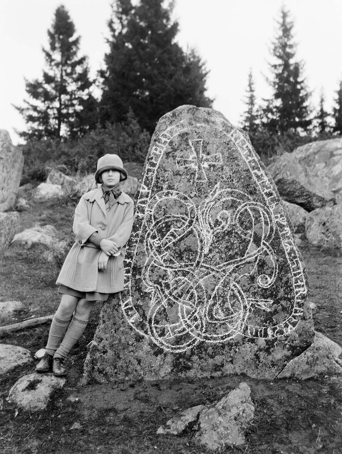 Девушка с руническим камнем в Лейсте, Швеция, 1926 г.