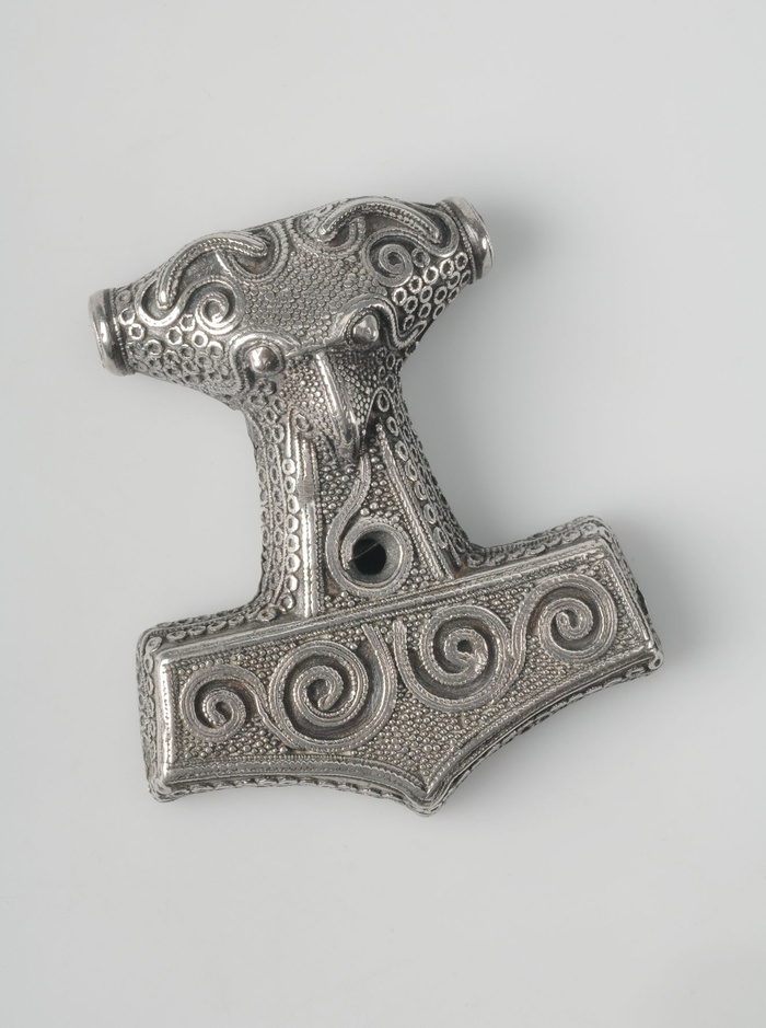 Амулет-подвеска в виде молота Тора - мьёллнира. Датируется 800-1099 годами. Изготовлена из серебра. Высота 51 мм. Из собрания Statens historiska museum, Стокгольм.