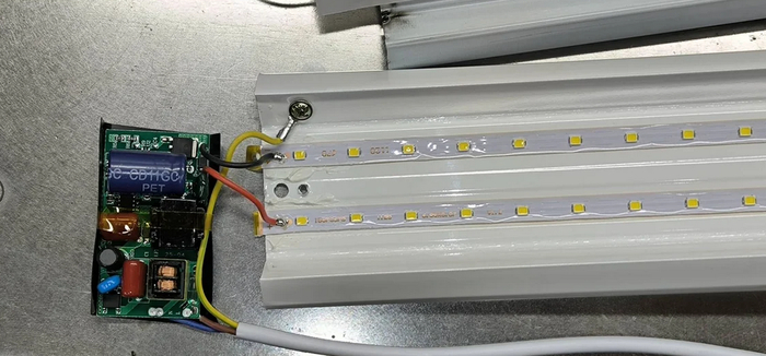 Может, не самыми-самыми дешёвыми, но около того. Сие изделие продаётся у нас в диапазоне 300-450 рублей (в 2025 году), выглядит почти у всех "брендов" очень одинаково и имеет схожую начинку. Эти светильники мимикрируют под старые люминесцентные: имеют стандартные размеры в длину - 60, 90 и 120 см, а также мощность - 18, 26 и 36 Вт соответственно. У них хлипкая конструкция и тонковатый металл (хватает, чтобы не греться сильно), но давайте на чистоту, не пофиг ли на это? Они не супер-надёжные, но за такую цену полностью себя оправдывают. Их цена с лихвой перекроет мнимую экономию квантум-бордов или более серьёзных ламп с адекватным драйвером за 5К денег.