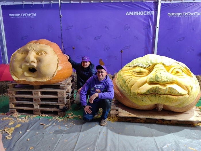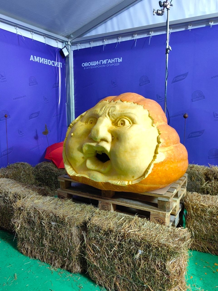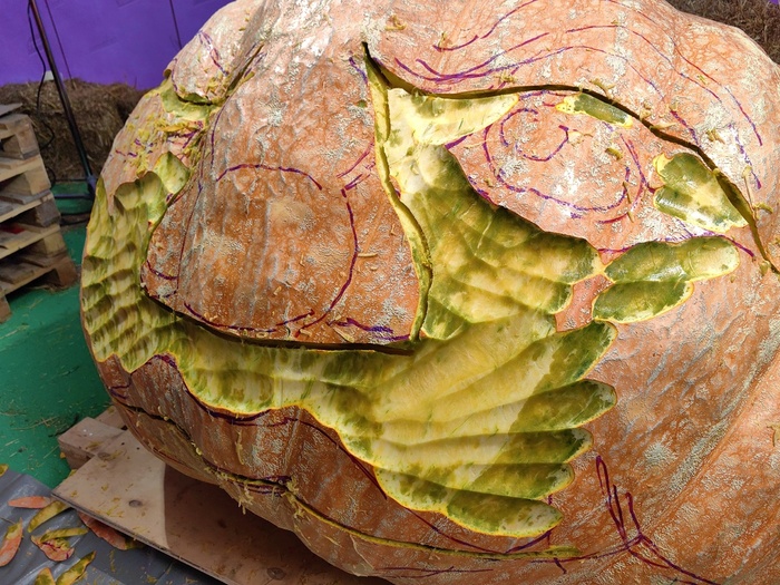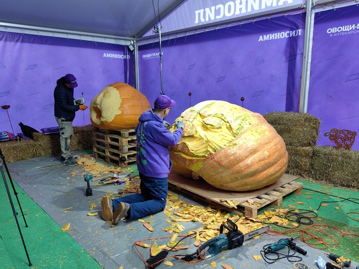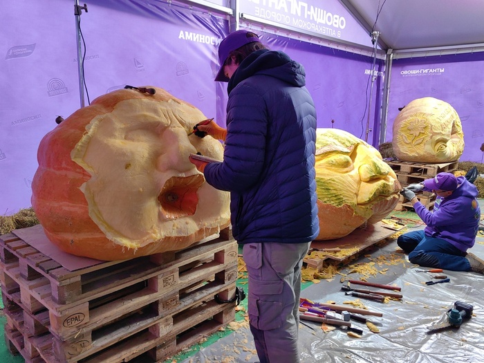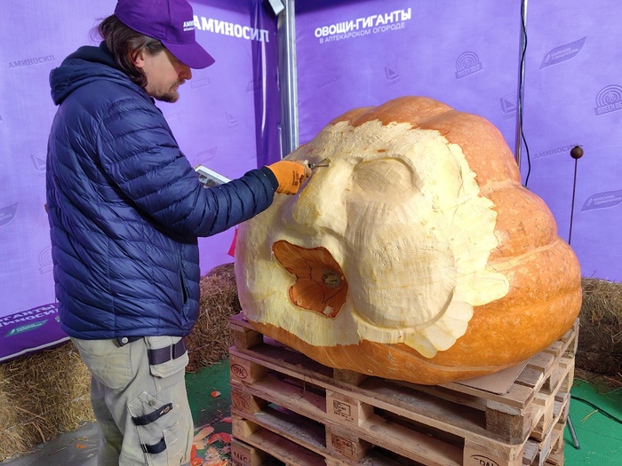 На дело согласились Сергей Кныш – чемпион мира по ледовым скульптурам и скульптурам из песка и Иван Савенков, тоже именитый скульптор. Всё происходило в течение шести часов. Этого достаточно, чтобы сделать из тыквы нечто эдакое. Можно было в реальном времени наблюдать за процессом. Вот, например, запись прямого эфира: