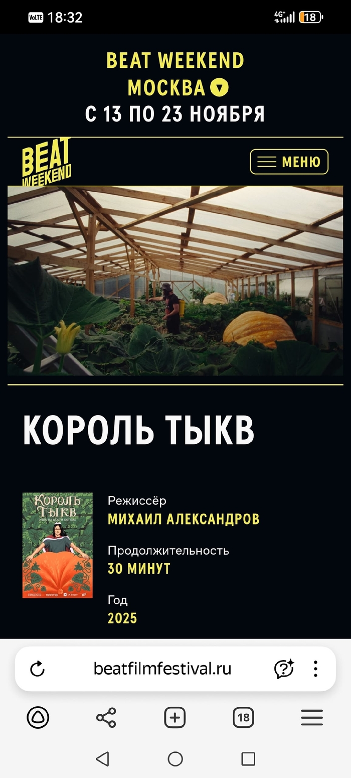 Вот и всё, хотел бы я сказать… Но оказалось, что в ноябре выйдет фильм со мной в главной роли. Удивительно! Короткометражка о том, как я выращиваю тыквы. Не совсем о выращивании, но больше о мечте. Даже можно будет в кино сходить, но сеансов мало — по два показа в разных городах. Подробности о показе можно узнать тут: https://beatfilmfestival.ru/movies/korol-tykv?ysclid=mh3l2f0....