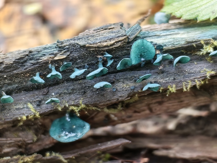 Гриб называется хлороцибория сине-зеленоватая, он окрашивает древесину в сине-зелёный цвет. Впервые такой увидела.