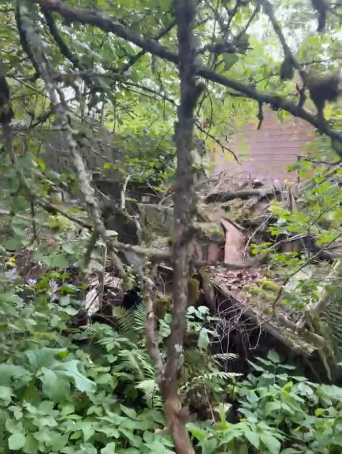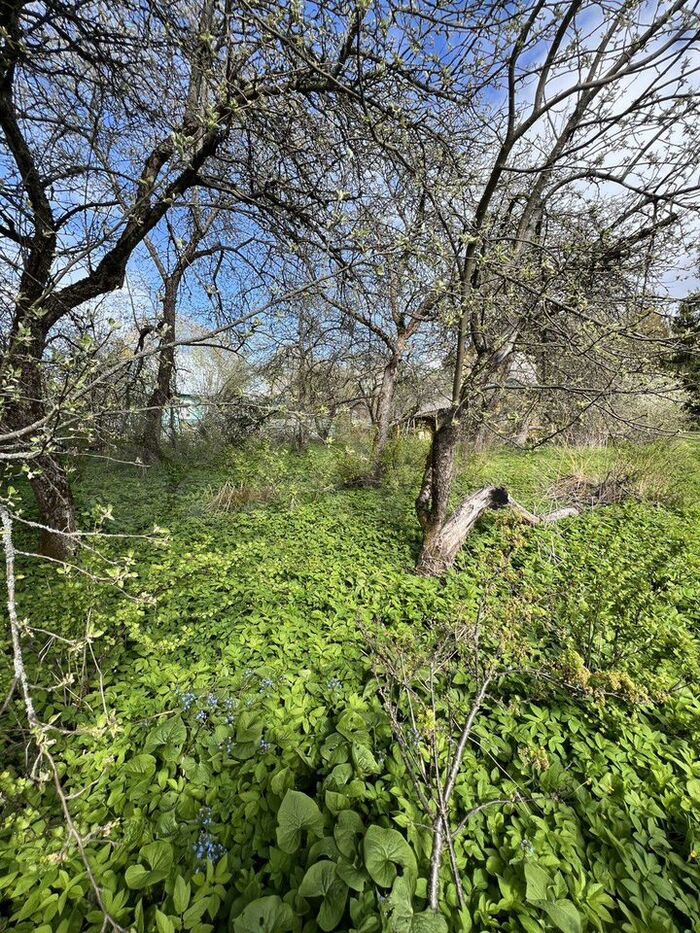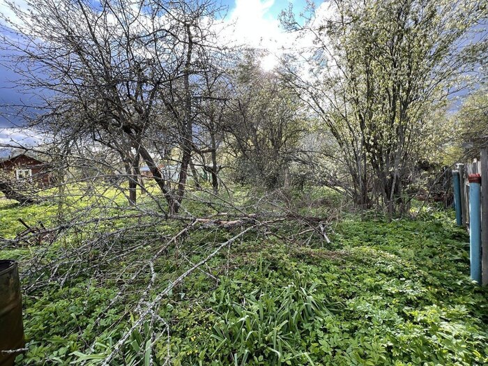 На фото скрин из видео плохого качества разваленого сарая, фото участка и дома с улицы, фото яблоневого сада с другой стороны дома. Яблоневый сад фотографировался в межсезонье, когда такого количества зарослей за домом уже не было
