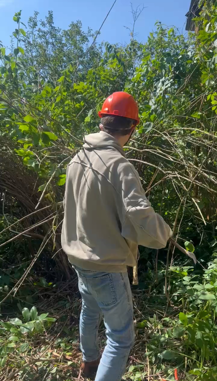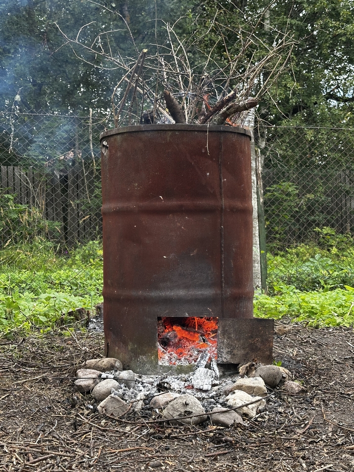 Итог сезона-2025: Передняя часть участка расчищена. Появилось понимание масштабов и первые мозоли. Гора веток сожжена в бочке, часть древесины запасена.