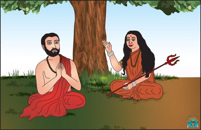 Однажды, когда он со своего балкона смотрел на Гангу, где по всем направлениям сновали лодки, перекрещивая свои многоцветные паруса, он заметил, что одна из них подплывает к террасе. По ступенькам поднялась высокая красивая женщина с распущенными волосами, в платье цвета красной охры, какие носят саньясины. Ей было лет тридцать пять — сорок, но казалась она моложе. Ее вид поразил Рамакришну, который попросил ее войти. Она вошла и, едва увидев его, начала плакать, говоря:
