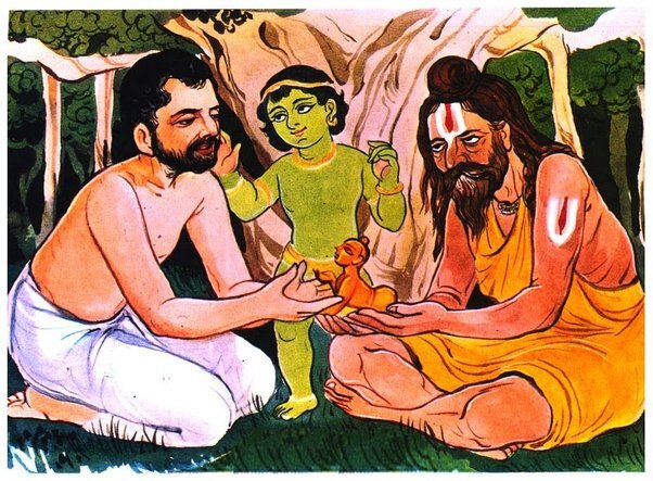 — Бывали дни, — продолжал Рамакришна свой рассказ, — когда Джатадхари приготовит пищу для обрядового подношения Рамлале, но не может найти его. Он в тревоге прибегал в мою комнату, где и обнаруживал, что Рамлала играет на полу. Джатадхари страшно обижался и сердито говорил: «Я столько провозился, готовя тебе подношение, я тебя искал повсюду, а ты вот где был все это время! Тебе дела нет до меня! Ты все забыл. Всегда ты был таким — ни доброты в тебе нет, ни привязанности. Что вздумается, то и делаешь. Бросил своего отца и ушел в леса. Бедный отец, он умер от тоски, а ты даже не вернулся, чтобы он перед кончиной мог взглянуть на тебя!»