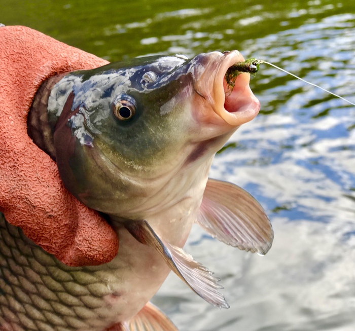Для такой рыбалки не самый удобный вариант. Но сазан заглотил крючок надёжно, поэтому оказался на берегу.