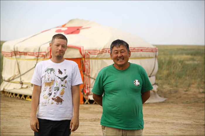 Вот Сергей и Геннадий — наука. Они проверили факты поста и уточнили размер популяции. За спиной парней кибитка, которую привезли для праздника открытия экотропы. Сейчас это просто фон, она никак не используется. Обратите внимание, судя по футболке зампонауке, в заповеднике водятся слонопотамы:
