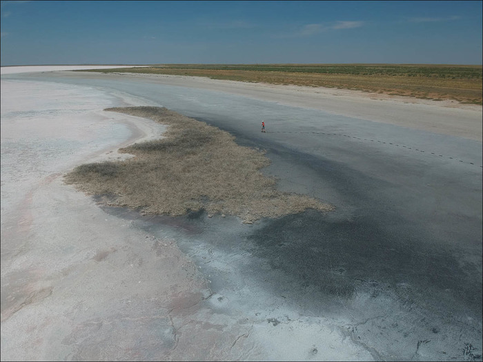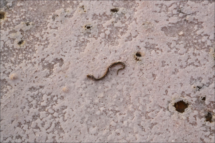 В этом году в солончак начал лазить молодняк песчаного удавчика. Это та самая змея, которая умеет ползать в верхнем слое песка как подлодка. Похоже, что они привыкли ходить на ту сторону за какой-то пищей в приграничном слое до соли, но с ростом популяции начали «срезать» через озеро. Результат — отравление солью где-то на трети пути. Поскольку это гипотеза, сотрудники заповедника при проезде мимо этой саги останавливаются, собирают удавчиков по краям озера (в середине уже бесполезно, даже если они живые) и выносят на траву. Если гипотеза верная — это естественный ограничитель популяции. Если нет — надо спасать змей, и они спасают, как получается.