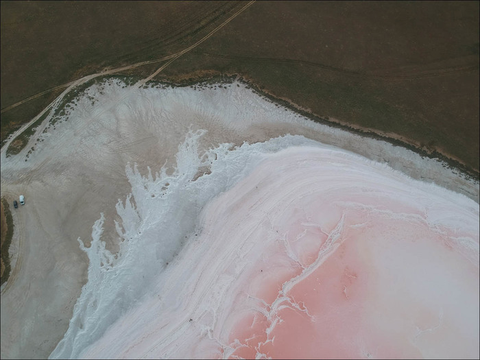 Это сага, то есть солёное озеро. Розовый цвет у него из-за маленьких ракообразных Artemia salina. Это те самые черти, которых едят фламинго, и от этого розовеют. А здесь порозовела вся сага. Потому что в такой дикой концентрации соли не выживает никто кроме бактерий и, собственно, артемий.