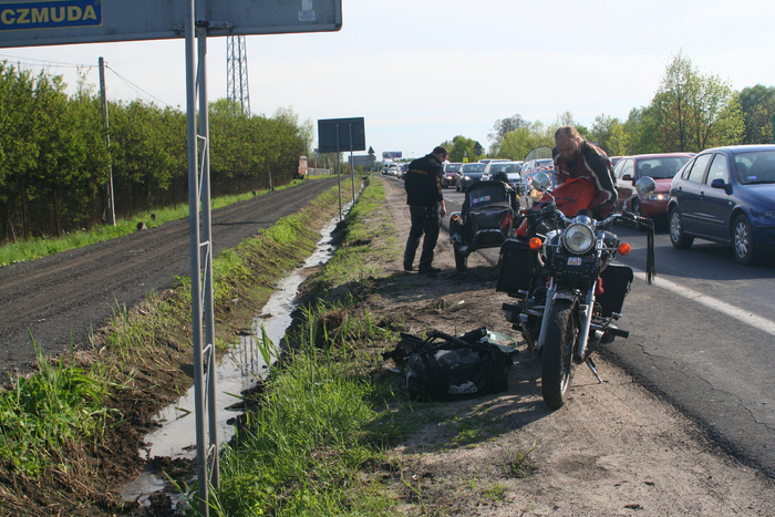 Откуда-то появляется женщина-полицейский. Я начинаю волноваться, однако правоохранительницу интересует только, не нужно ли вызвать скорую: благодарим и вежливо отказываемся. Тем временем вокруг собирается несколько проезжих мотоциклистов. Ругаясь чистым русским матом, польские байкеры оперативно перекрывают движение, мы цепляем Зелибобера тросом к какому-то автомобилю и вытаскиваем бедолагу обратно на дорогу. Спасибо вам, парни!