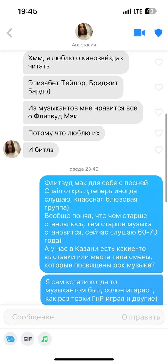 За месяц до описанных событий. Я активировала анкету в приложении для знакомств. И лениво общалась там. Приходит сообщение от мужчины из Москвы. А я обитаю в другом городе. Далее копирую переписку с ним, убирая дату и имена: