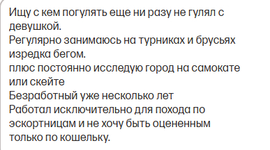 Когда уже доходило до встреч, не складывалось по разным причинам-фото мужчины не совсем совпадало с тем, кто пришел на встречу (не только дамы умеют в ретушь), выливание говен на своих бывших (реально, гуляла с парнем 1,5 часа, и час из этой встречи слушала о меркантильной бывшей бабе), кто-то признавался в том, что безработный и живет с родителями (все допускаю, но об этом стоит сразу говорить), кто-то живет с мамой, просто потому что ему и так окей (возраст мужчин от 40 до 45), кто-то не планировал следующие встречи и писал по факту, когда появилось время «что делаешь? Давай через увидимся» (это неуважение к времени другой стороны, и говорит о незаинтересованности, имхо). Кто-то, после нескольких встреч и общении, перетекающим в начало отношений на мое робкое «мб удалим анкеты?» наотрез отказывался это делать и говорил, что «ачетакова, просто сижу, ни с кем там не общаюсь», ну, сиди милый, не заставляю, просто пойду дальше.