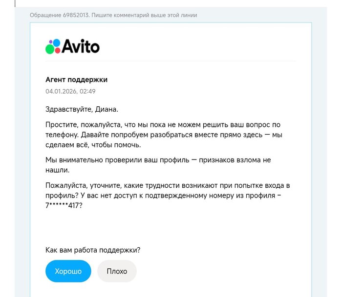С 5 января было крайнее сообщение от поддержки @Avito, далее мои сообщения с вопросами игнорируются. В чатах — тишина. По телефону — «ваш звонок зафиксирован». И всё.