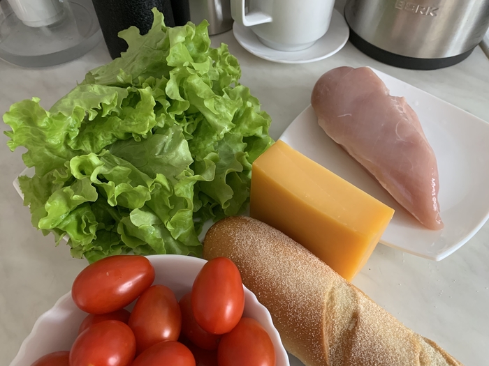 На первый взгляд можно сказать: ну что там такого особенного - куриная грудка, помидоры Черри, листовой салат и сыр? Однако, всё дело - в заправке:) с неё-то я и начну:)
