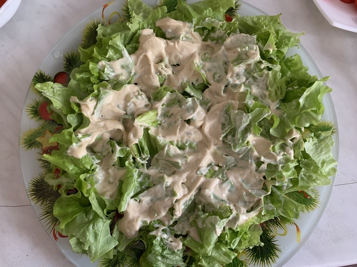 6. Нарезать листья салата, полить 2 ст.ложками лимонного сока, добавить половину готового соуса и половину сухариков, все аккуратно перемешать.