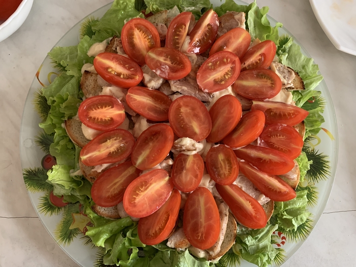В миску с яйцом добавляю лимонный сок, вурчерский соус, соль, перец, взбиваю все блендером. Затем тонкой струйкой не переставая взбивать вливаю масло. Довожу до однородности. К этому времени сухарики готовы. Нарезаю курицу на средние кусочки. Выкладываю курицу, сухарики поверх салата с помидорами, посыпаю все это дело сыром и поливаю соусом. В итоге получается следующее)