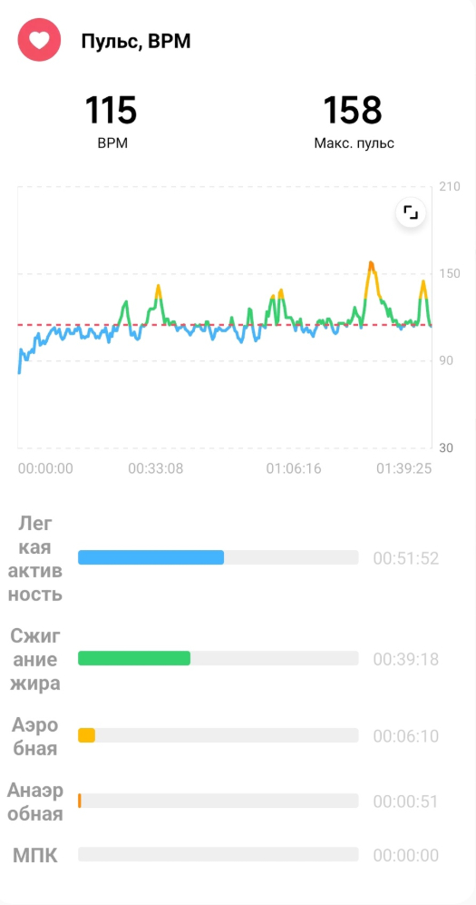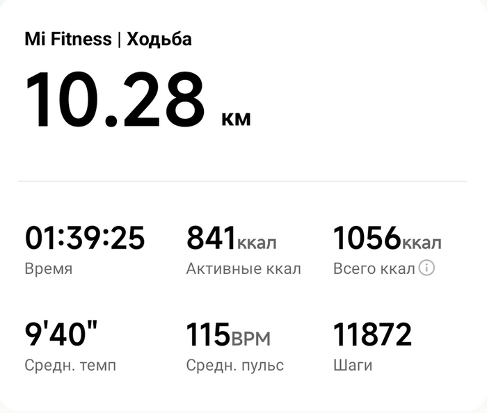 В целом, как видно из метрик, так и должна проходить моя среднестатистическая кардио-тренировка. Ноги несли, дыхание было слегка учащено. Усталости, как таковой не чувствую. Есть небольшая усталость ног, но думаю, что еще смог бы пройти столько же, если бы чуть сбросил темп. Пульс был высоковат, но всему виной тот факт, что я не принял прописанную мне таблетку. Как показывают метрики, если я принимаю таблетку, то пульс режется настолько, что часы мою тренировку даже не всегда заносят в легкую активность.