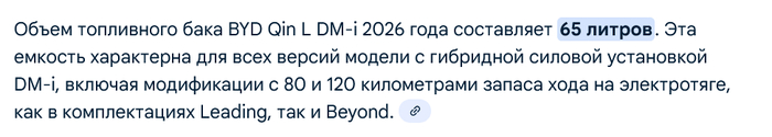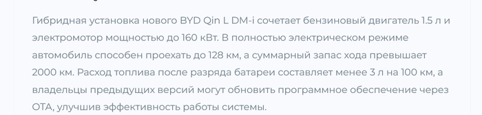 Выскажу свое мнение, Очередная китайская шушлайка, с кликбейтной рекламой, прочитав ее вы подумали что это правда, нет скажу я вам, если мы посмотрим краткое описание с сайта, то увидим, что это гибрид с маленькой батареей, и эта машинка небольшого размера, имеет вес до 1.8 тонны, сразу бросается в глаза обещание проехать на высаженном акб, только на двс с расходом 3 литра на 100, мы с вами знаем сколько потребляет солярис 1.5 или шкода, 8 литров+ тут нужно заряжать акум, что увеличивает потребление, кстати бак у нее 65 литров, если проедет 550км на баке то сильно повезет.