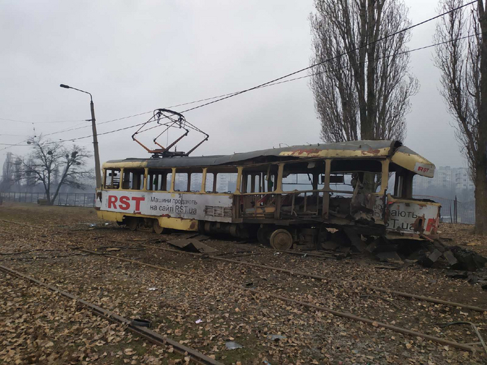 Уничтоженный подвижной состав в результате обстрела Салтовского трамвайного депо.
