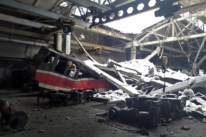 Tatra T6A5 № (8648) Вагон полностью уничтожен в результате попадания реактивного снаряда в производственный корпус и обрушения части крыши.
