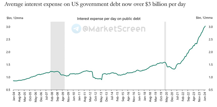 Последние данные Министерства финансов показывают, что правительство США в настоящее время выплачивает в среднем 3 миллиарда долларов процентных расходов в день, включая выходные.