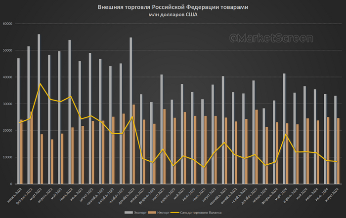 Получаем абсолютно стабильные 2023-2024 года. Я не вижу в этом году существенных провалов по импорту. Не вижу их и по экспорту. Летом сальдо припало слегка, но это не минимумы. Причина – падение экспорта.