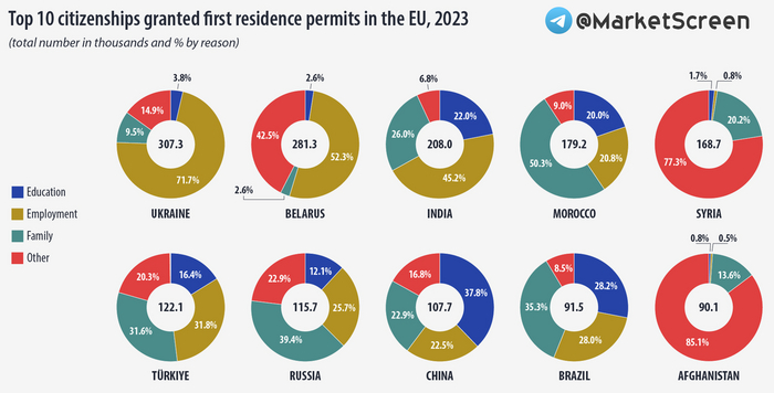 Никто не сомневался, что основным источником релокантов выступила прекрасная страна Украина. ЕС, кружевные трусики, все дела. 307,3 тысячи гарных хлопцев и дивчин. У них, кстати, самый большой процент «по работе» – 71,3. На втором месте белорусы. У них тоже работа, но и отхеров в избытке. Третье место за Индией.