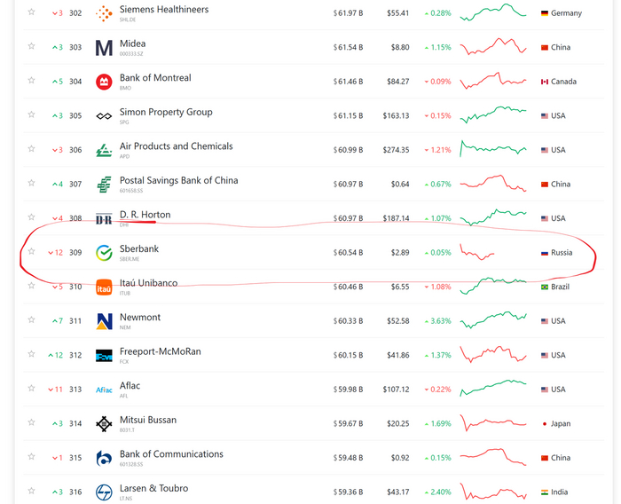 Крупнейшая по капитализации компания нашего с вами фондового рынка Сбербанк находится на 309 месте в мировом списке крупнейших по капитализации компаний.