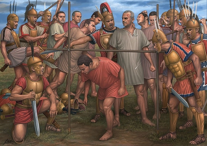 Наверняка вы все слышали про самнитские войны. Так вот, после тяжёлых поражений в горах Самния римляне выкинули на свалку истории громоздкую фалангу и подсмотрели у самнитов «фалангу с шарнирами» — манипулярный строй. Разреженные «квадраты» из воинов (манипулы) могли сгибаться, пропускать товарищей назад и втягивать чужую фалангу в разрывы. Конечно, все эти военные действия были приправлены щепоткой религиозности, например ритуал devotio, когда полководец клялся пожертвовать своей жизнью божествам подземного мира в обмен на победу. Кстати говоря, аквила (орёл легиона) воспринимался как религиозный символ, который был непосредственно связан с Юпитером. Сами понимаете, что в средние века такие аквилы будут называться хоругвью, правда там уже и изображён будет не символ легиона, а лик Христа.