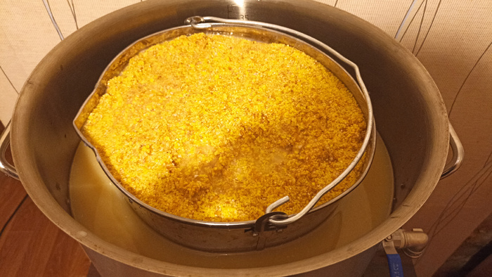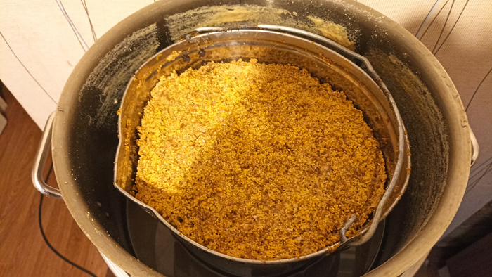 Солод нужно измельчить, я это делал с помощью мясорубки. Полученный содовый фарш посещаем в кастрюльку заливаем горячей водой 70С, укутываем чем нибудь и оставляем на 1 час, для того чтобы получить сладкую массу. После охладить до 30-32С.