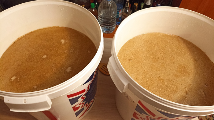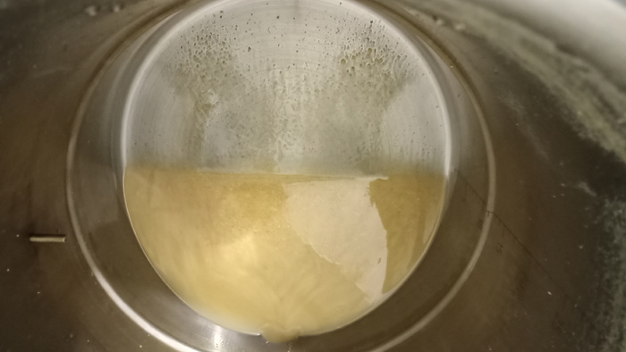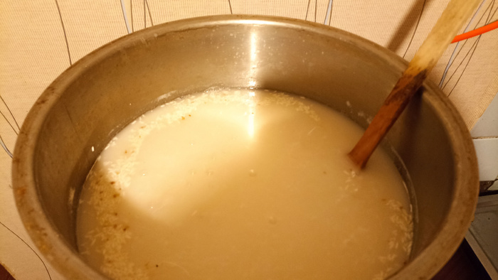 Заливаем кипятком и оставляем распариваться на 2 часа, после этого охладить до 68-70С и добавить перекрученный зеленый солод. Укутать и оставить ещё на 1,5-2 часа. Осахаренное сусло необходимо охладить до 30-33С и внести закваску. Общий ГМ 1/5. Брожение не такое активной как на культурных дрожжах, но всё равно не займёт много времени.
