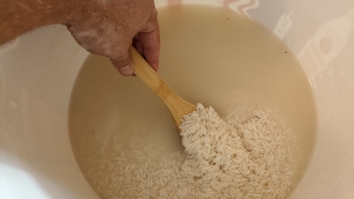 Зерно надо промыть до чистой воды и убрать всю всплывающую шелуху. Далее налить крепкий раствор марганцовки, для обеззараживания и оставить на 15-20 минут.