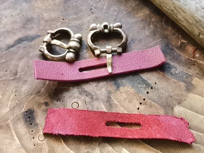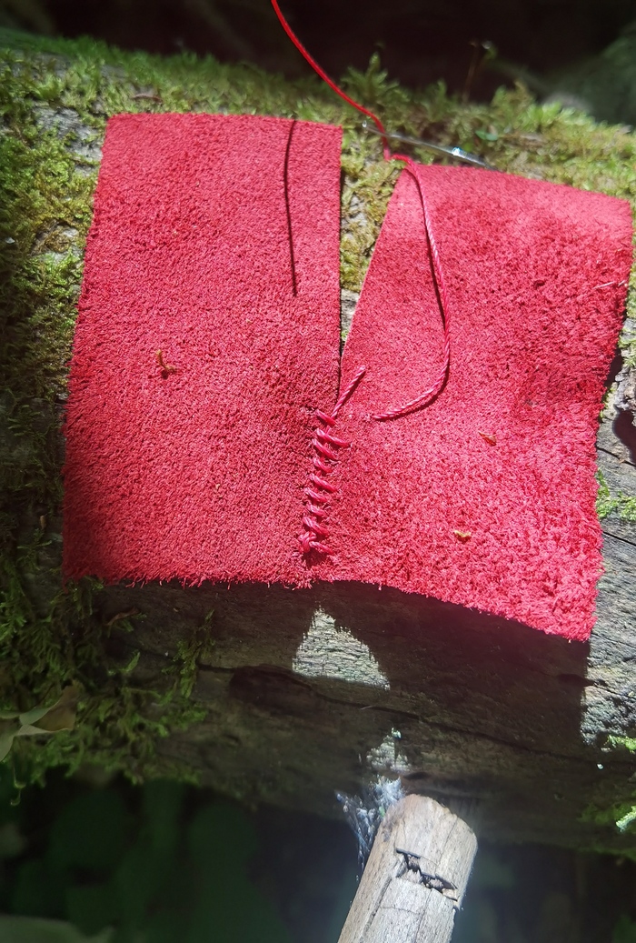 У средневековой обуви все швы скрытые, так что потренируемся на двух кусочках кожи. По принципу не отличается от сшивания кожи на себе, что я, как человек, регулярно занимающийся чем-то травмоопасным, периодически практикую.