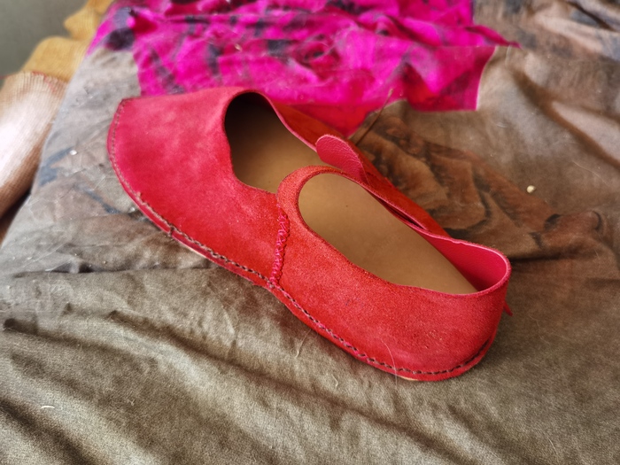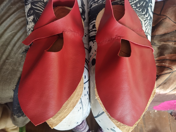 Сшиваем подобным образом куски тапок, их всего два. Чуть позже я догадалась приделать дубляж задника, отчего пяточная часть вышла прочнее и ремешок там тоже вышел более надёжным.