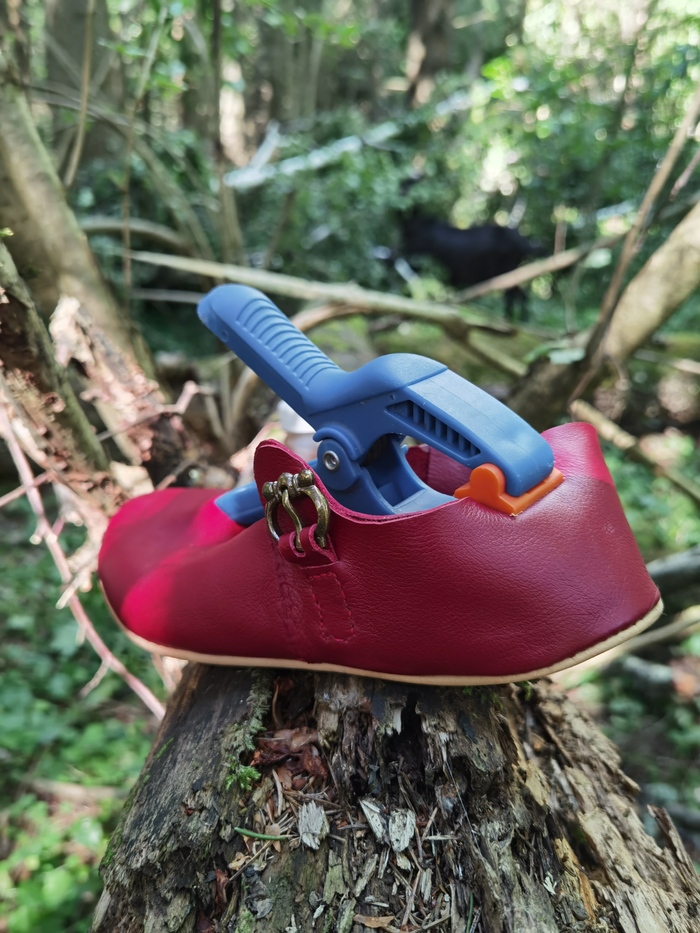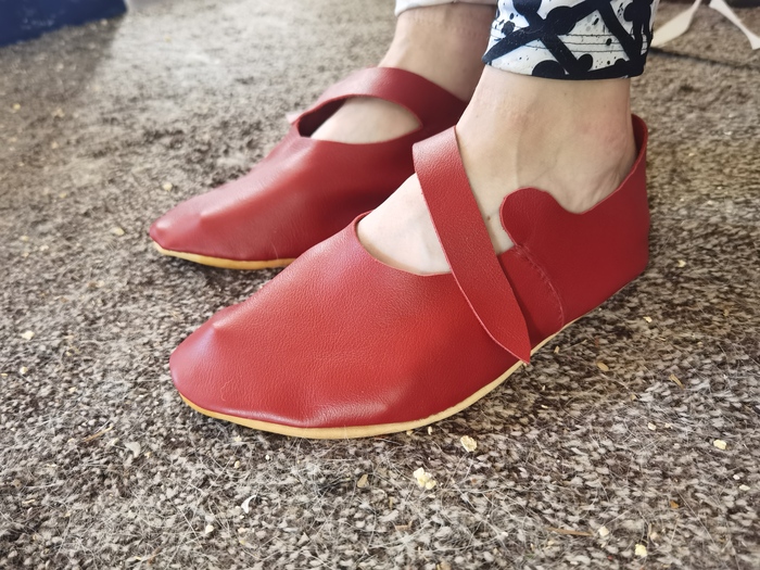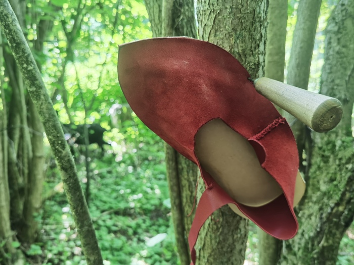 После этого я дошила сумку и ремень, но про них потом. И начинаем в тапках ходить. Я гуляла в них несколько дней по лесу, они пережили это, после чего я их почистила и провощила для защиты от воды. На выезде тапки продержалась прекрасно, я бегала по камням, по лесу, по полю, лазала по стенам, осадным башням, скакала верхом и всё это они выдержали на ура. Я успела сделать ещё одни тапки для знакомого, две поясные сумки, ремень, так что теперь, будучи кожевником 7lvl, я замахнулась на более серьёзную вещь с рантовой подошвой.