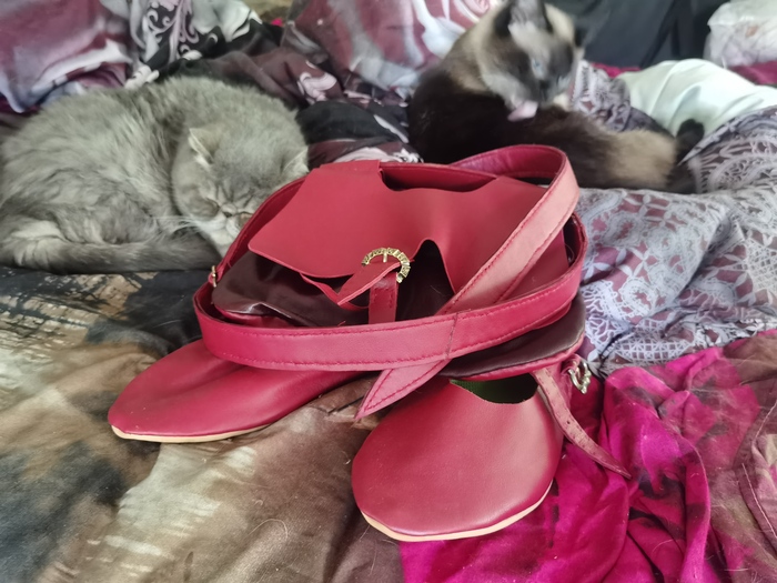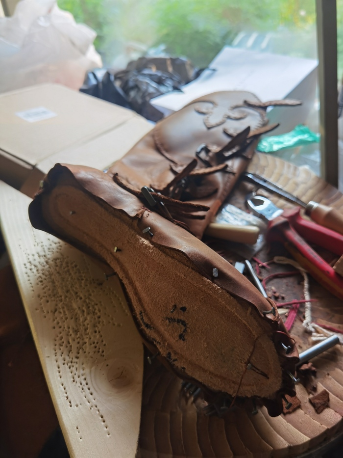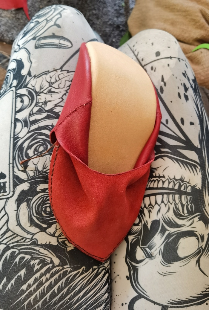 Шить я, как любая девочка, рождённая в СССР, умела с рождения. Так сложилось, что моя и без того красочная жизнь украшена теперь реконструкцией, и был намечен выезд в поля "в дурацком" на должности сквайра. Сквайр в женском это такое себе, так что я сшила полный мужской костюм, заморочилась с плетением шнурков, сделала для них медные эглеты, и сшила сама всё кожаное. С кожей я работала второй раз в жизни, но она не сильно отличается от ткани, те же иглы, только толще. Итак, тапки.