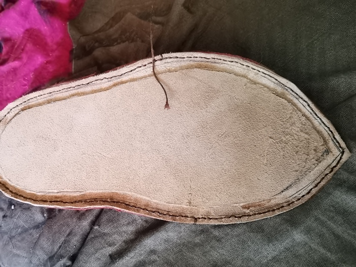 Когда два тапка сшиты, выворачиваем на изнанку и пришиваем к подошве. Да, кстати, на месте вощёных ниток, в идеале, должна быть льняная дратва. Но это в следующий раз, в этот раз просто нитки.