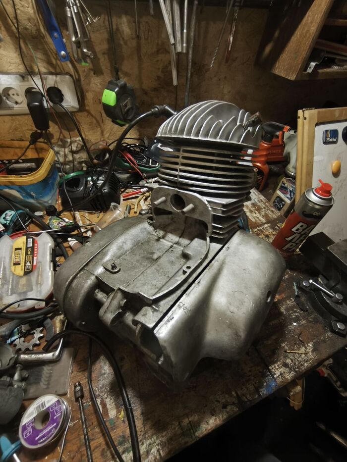 За основу взяли китайский немецкий мотор с озона тыщ за 7 вроде. И это было ошибкой. Из-за тяжёлой рамы, больших задних колес и большого передаточного числа центробежное сцепления не справлялось с такой нагрузкой и перегревалось до красна после 15 минут работы. Решили менять мотор полностью. После долгих поисков остановились на моторе мотоцикла восход 2. Удивительно, но мотор с Донецка пришел быстрее, чем любой заказ озона с подмосковного склада