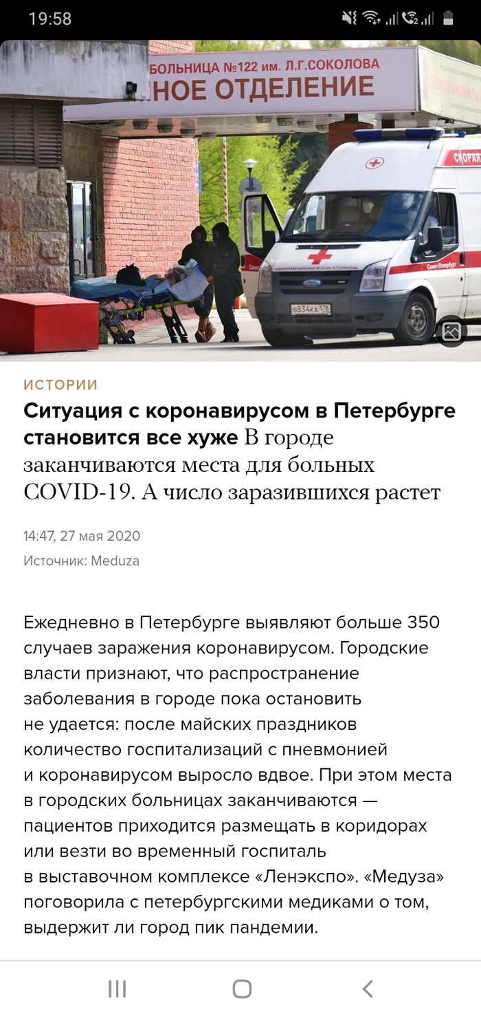 Народ ! я устал всем писать индивидуально , напишу тут . на работе нас высадили на самоизоляцию в конце марта , и 6-го мая вывели на работу в полном объёме . 2-го мая я затемпературил , температура 38.5-38.2 , кашля не было есть не хотел , почти всё время лежал . 6-го мая надо на работу , а температура не спала , вызвал врача (по дмс) , он дал больничный ... по давлению , ибо температуры не обнаружил . 10-го мая явка в поликлинику . пришёл , говорю стало болеть тут и тут (в области лёгких) , меня на рентген , диагноз - пневмония , и под вопросом двусторонняя . врач вызвала скорую , я попросился домой - собрать вещи , она сказала : "родственники привезут" . приехала скорая , отвезла на компьютерную томографию лёгких - двусторонняя пневмония с поражением 13 % лёгких . отвезли в ленэкспо .