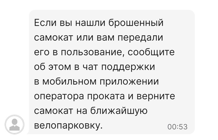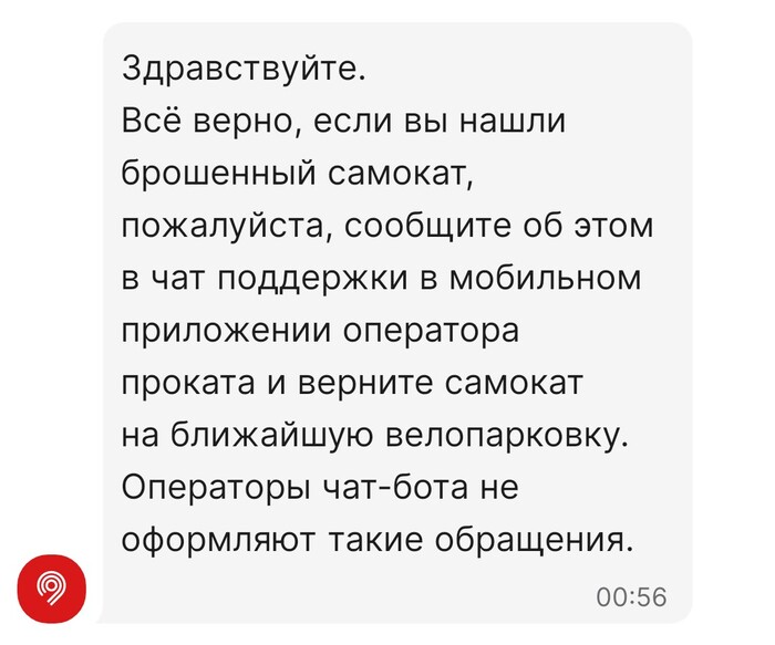 5. (бонус) Чат бот Московского транспорта и оператор на скрине ниже. Те, "если нашли самокат брошенным - верните до ближайшей парковки. Сделайте работу за нас. А мы все вместе получать деньги будем на вашей улице".