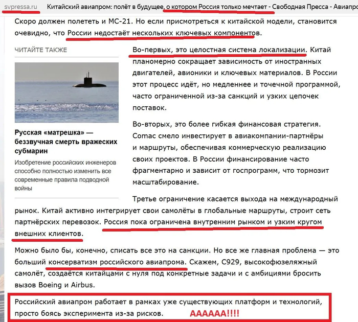 Наша засоветская "Свободная пресса" отбрасывает химеру совести (адекватности?). В единственной на планете стране с поднятыми в небо и готовящимися к коммерческой эксплуатации полностью отечественными ближне- и среднемагистральными лайнерами нам рассказывают у кого РФ должна поучиться...импортозамещению в авиастроении. Причём такому, о котором России остаётся "только мечтать".