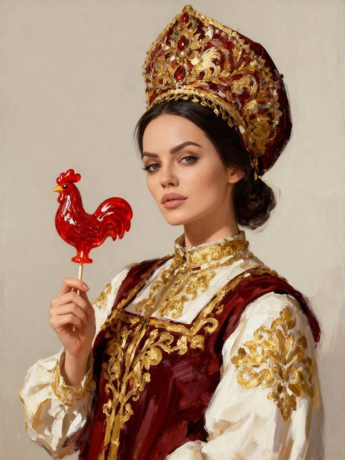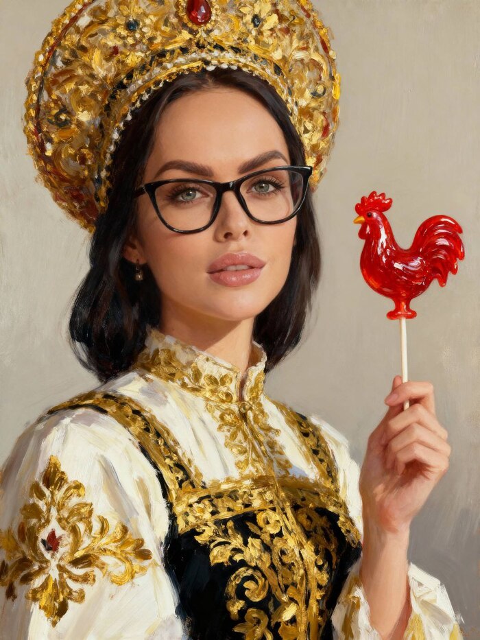 Минималистичная картина маслом в стиле Vogue, изображающая милую и красивую молодую русскую женщину с фарфоровой кожей и темными волосами, в богато детализированном русском кокошнике и традиционном русском народном костюме с золотой вышивкой и витиеватыми узорами. Она держит в руке глянцевый красный леденец в форме петуха, изящно расположившись на гладком нейтральном фоне. Ее лицо написано мягкой, безупречной кистью, контрастирующей с густыми, сильно текстурированными мазками мастихина на ее одежде и кокошнике. КОМПОЗИЦИЯ ДЛЯ МОДНОГО РЕДАКЦИОННОГО ФОТО, ДРАМАТИЧЕСКОЕ ОСВЕЩЕНИЕ, ЛЕГКИЕ ТЕНИ. СТИЛЬ, ПОДОБНЫЙ ОБЛОЖКЕ ЖУРНАЛА VOGUE.