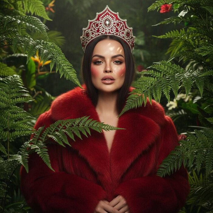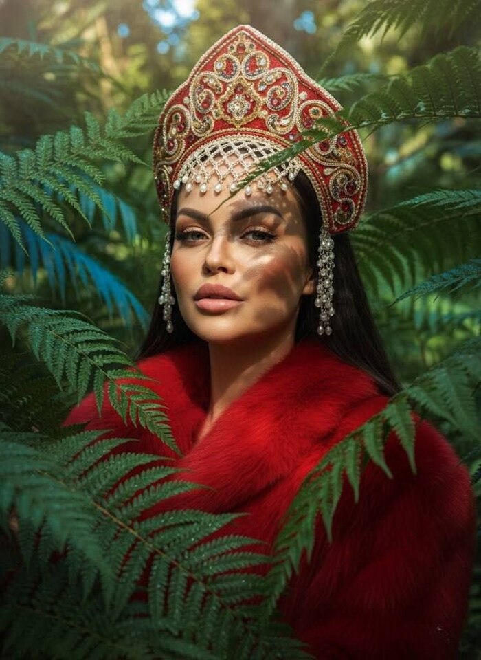 Русский портрет в стиле Vogue, на котором изображена милая и красивая молодая русская девушка с чистой кожей и тёмными волосами, в богато украшенном русском кокошнике. Она позирует изящно на гладком фоне. Съёмка для каталога в джунглях. На лице спокойное выражение, слегка приоткрытые губы, пухлые губы и много румян на щеках. Лицо девушки среди листьев папоротника. Сквозь листья пробивается солнечный свет, создавая красивые тени на лице модели. На ней красная меховая шуба. Лето, солнечный день, яркие сочные цвета, мягкое яркое освещение. Высокая мода, haute couture, fashion-фотосъёмка.